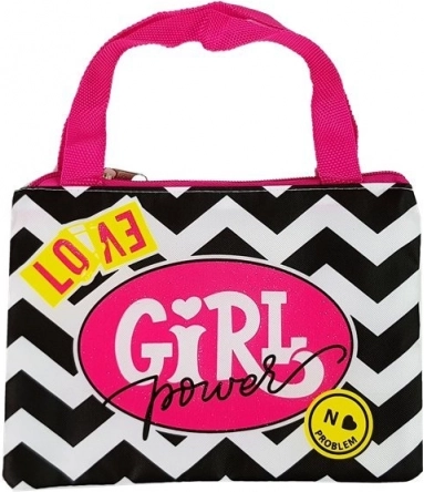 Piccola borsetta con motivo a zig-zag bianco e nero e scritta rosa 'Girl Power'.