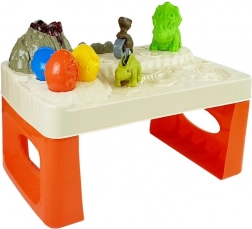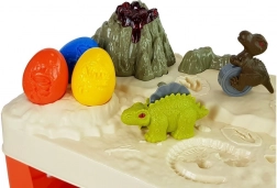 Il tavolo offre un vulcano con lava luminosa per un ulteriore livello di gioco. Inclusi ci sono tre uova che nascondono un piccolo dinosauro e tre animali preistorici più grandi per intagliare e fare calchi di motivi. Questo sviluppa la motricità fine e la coordinazione visiva dei bambini.