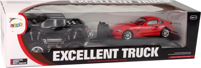 Veicolo fuoristrada per cui nessun ostacolo è spaventoso. Si comporta perfettamente sia sull’asfalto che sulle pietre irregolari. Un set creato per gli amanti delle macchinine, perché include due auto in stili diversi. La prima è un MONSTER TRUCK nero con possibilità di agganciare il rimorchio incluso nel set. La seconda è una BMW bianca che può essere trasportata sul rimorchio. I modelli sono realizzati in plastica antiurto.