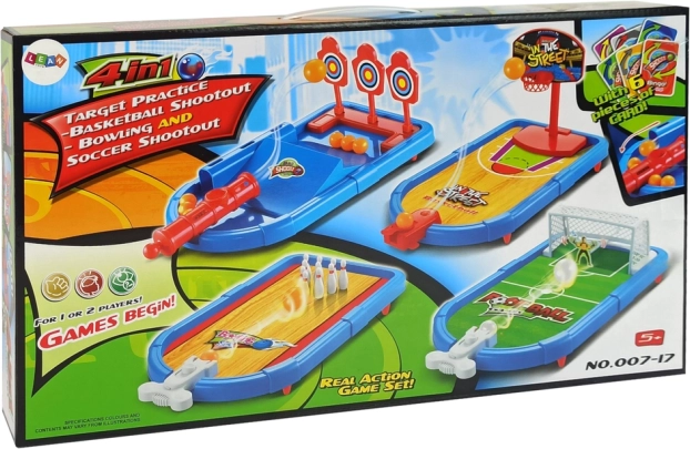 Il set da tavolo 4 in 1 unisce basket, calcio, bowling e tiro al bersaglio in un unico kit compatto. Struttura leggera e portatile, montaggio rapido e divertimento per 1–2 giocatori dai 5 anni. Inclusi lanciatore di palline, porta, canestro, birilli e carte segnapunti. Ideale per il divertimento in casa, dimensioni del gioco 38 × 21 × 10 cm.