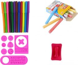 - Lavagna, 12 pennarelli, 12 gessetti, sagoma con forme, sagoma con lettere, pennarello luminoso