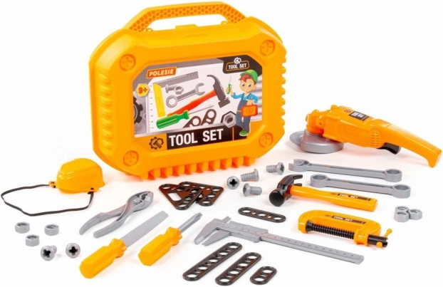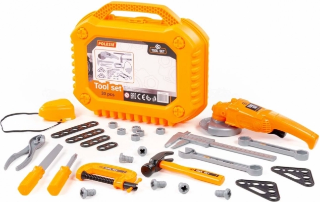 Il set di attrezzi per bambini è progettato per i piccoli fai-da-te che vogliono imitare mamma o papà durante i lavori in officina e in giardino. Tutti gli elementi sono in plastica resistente, sicuri per il gioco e facili da riporre nella robusta valigetta. La smerigliatrice, premendo il pulsante, fa ruotare il disco; la maschera protettiva ha un elastico, quindi si adatta a tutti.