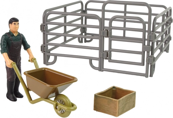 La figurina del contadino con carriola e il recinto con cancelletto apribile ampliano le possibilità di gioco e permettono di creare scenari di fattoria personalizzati.