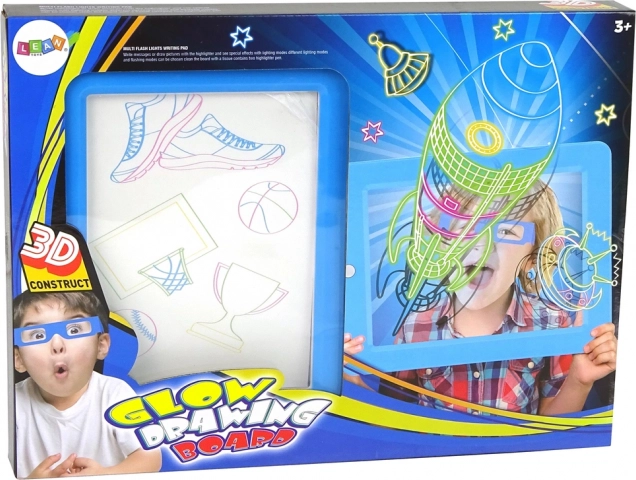 La lavagna magica illuminata è ideale per i primi passi nel disegno e nella scrittura. Il pannello trasparente con effetti LED illumina ogni tratto e, premendo un pulsante, attiva diverse modalità luminose. Basta inserire uno stencil, ricalcare i contorni con pennarelli fluorescenti e indossare gli occhiali 3D: i disegni si trasformano all’istante in uno spettacolo 3D.