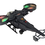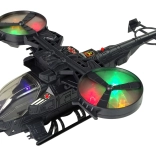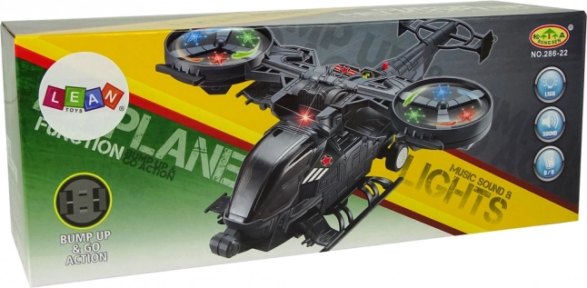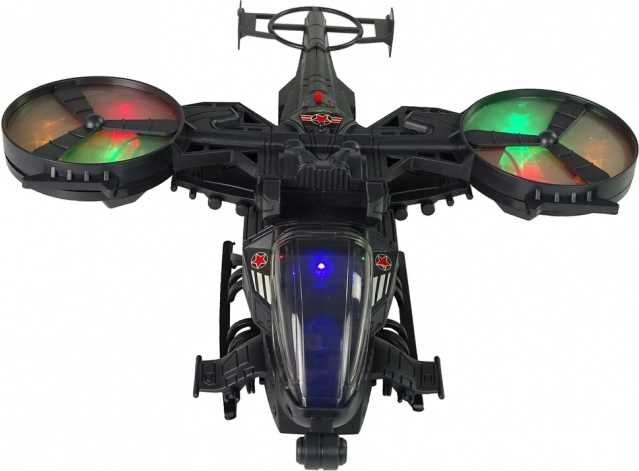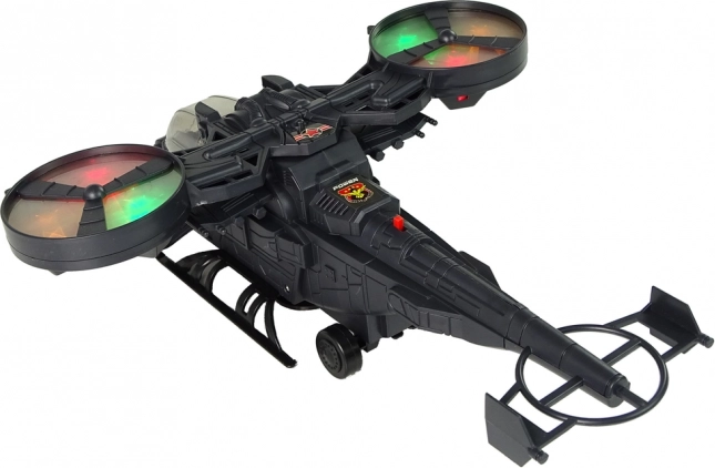 L'elicottero ha grandi eliche rotanti che brillano in diversi colori e sono accompagnate da effetti sonori che imitano l'avvio e lo sparo. Grazie alle ruote posizionate nella parte inferiore, l'elicottero può muoversi sul terreno.