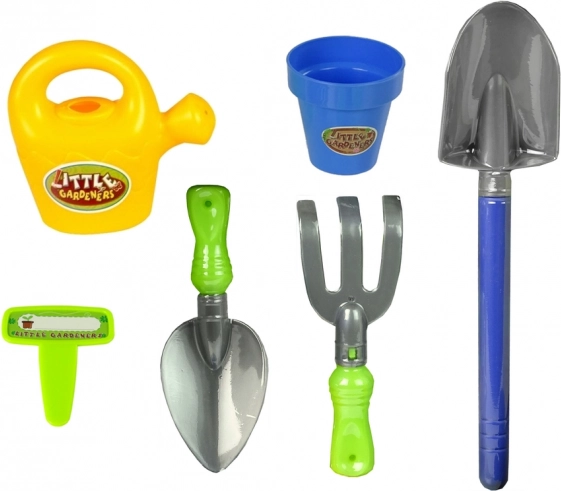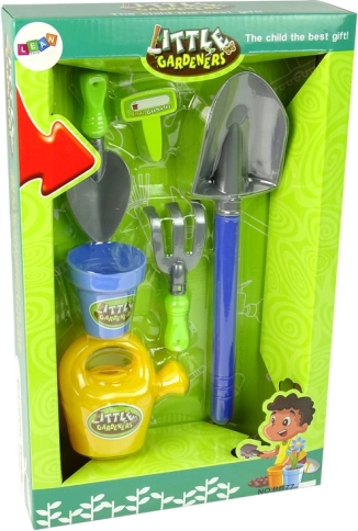 - Il set include un secchio, un vaso, una paletta, un annaffiatoio, una forca e una zappa.