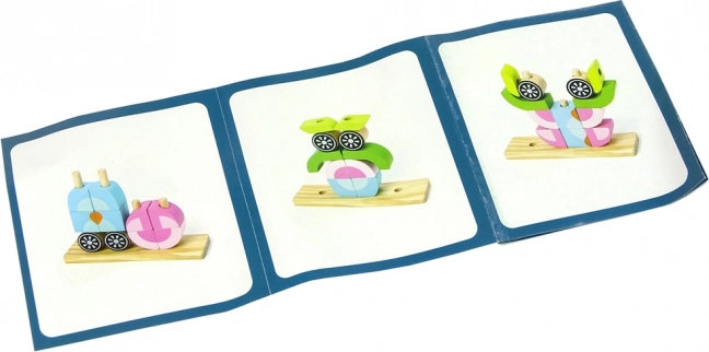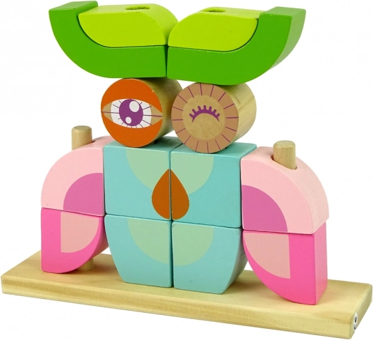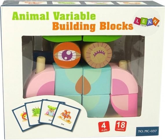Questo set include una base di legno e 12 blocchi che possono essere assemblati in varie forme, come animali o oggetti. Il bambino può inserire i blocchi nei perni della base in diverse configurazioni, sviluppando la creatività.