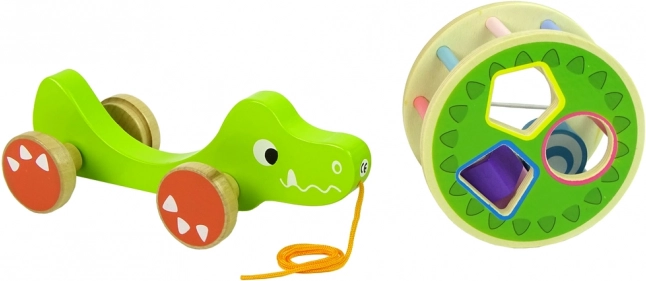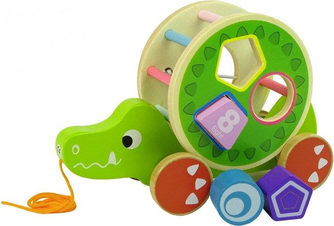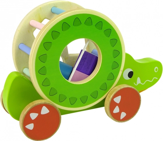 Il giocattolo in legno a forma di coccodrillo con sorter offre una serie di elementi educativi. Il grande cerchio con sorter e i tre blocchi sul dorso permettono di esercitare precisione, riconoscimento delle forme geometriche e migliorano concentrazione e pensiero logico. Il coccodrillo è dotato di bastoncini colorati che stimolano i sensi visivi del bambino e le ruote con corda facilitano il movimento del giocattolo. I blocchi all'interno funzionano come un sonaglio, il che attira e stimola i sensi uditivi del bambino. L'anello rimovibile sul dorso del coccodrillo consente più varianti di gioco.