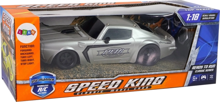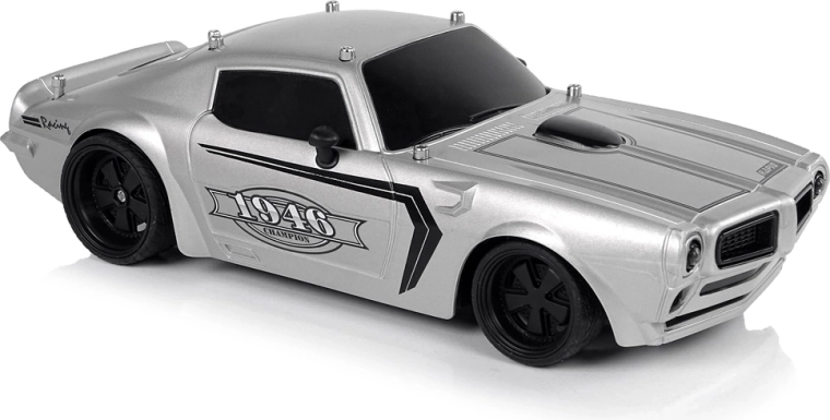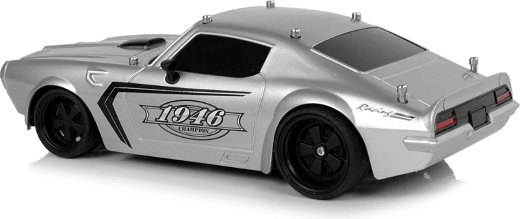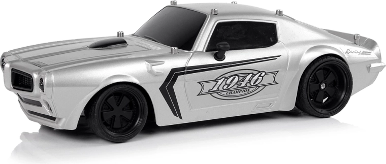 L’auto ha una struttura leggera e robusta, design sportivo con vetri neri e dettagli neri sul cofano e adesivi Champion 1946. Gli pneumatici in gomma garantiscono aderenza alla strada durante la guida. La guida del veicolo è un divertimento soprattutto per i più piccoli: il radiocomando incluso nel set permette di condurre il piccolo modello d’auto con due pulsanti separati per marcia avanti/indietro e per le direzioni laterali.