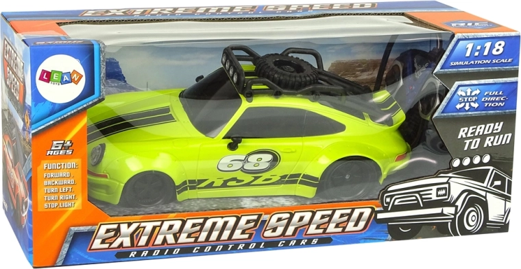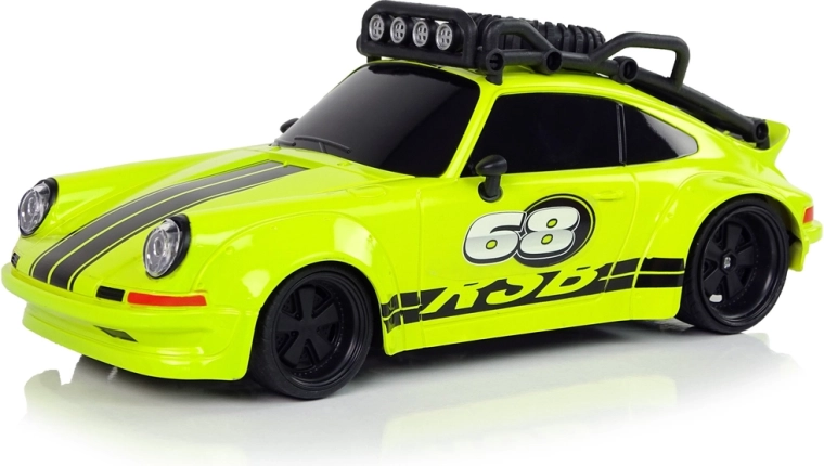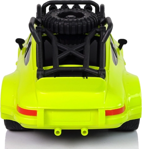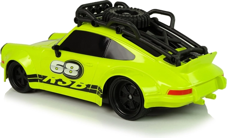 L’auto ha una struttura leggera e robusta, design sportivo con strisce nere sul tetto e sul cofano. L’aspetto esterno è impressionante. Sul tetto è montato un portapacchi con ruota di scorta e fari. Nulla ti sorprenderà durante la guida veloce. Gli pneumatici in gomma garantiscono aderenza alla strada. Guidare il veicolo è molto divertente, soprattutto per i più piccoli. Il modellino può essere controllato con il telecomando incluso nel set, dotato di due pulsanti separati per avanzare/indietreggiare e sterzare.