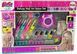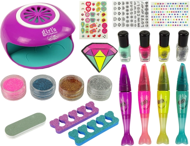 .Dopo aver uniformato la lunghezza e la forma delle unghie con la lima a forma di diamante, applica sulle unghie il colore scelto. Il passo successivo è inserire la mano nella speciale lampada per unghie. Dopo l’inserimento, si accende la luce proprio come in quella vera. Le penne permettono di dipingere motivi con precisione e sono disponibili in due colori. Dipingendo i motivi, la bambina sviluppa precisione e crea il proprio stile. Adesivi, diamantini e glitter aggiungono originalità e brillantezza.