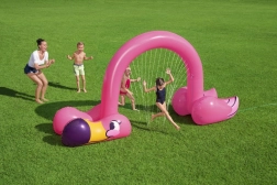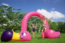 Questa grande porta gonfiabile con spruzzi in design fenicottero, collegabile al tubo da giardino, crea un fantastico tunnel d’acqua sotto cui i bambini possono correre lasciandosi bagnare da delicati getti. Grazie all’altezza di 1,93 m, anche gli adulti possono partecipare al gioco.
