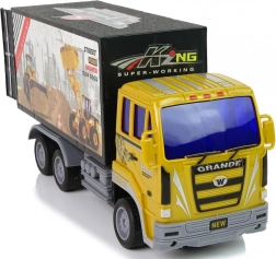 Il camion ha una cabina gialla e un container nero con adesivi distintivi, fedelmente ispirato a una macchina da costruzione reale.