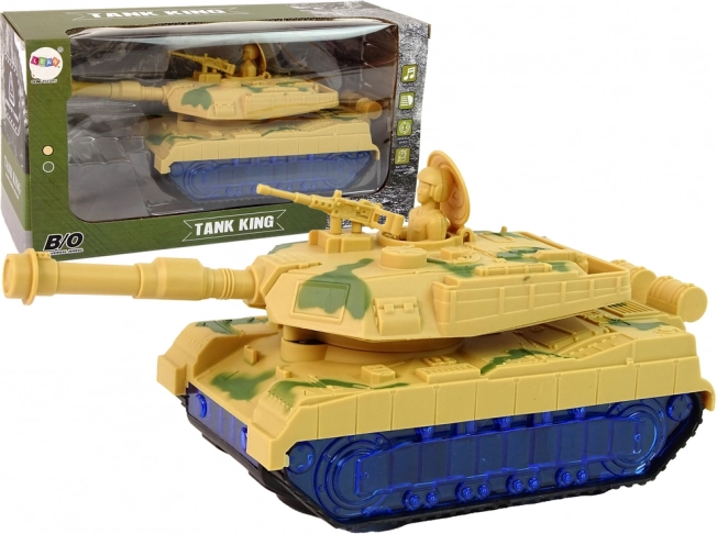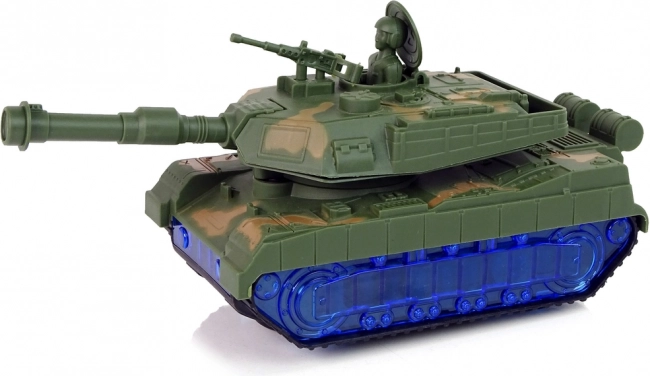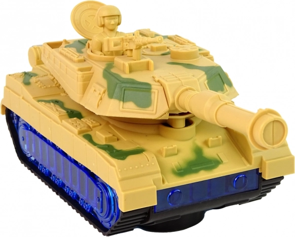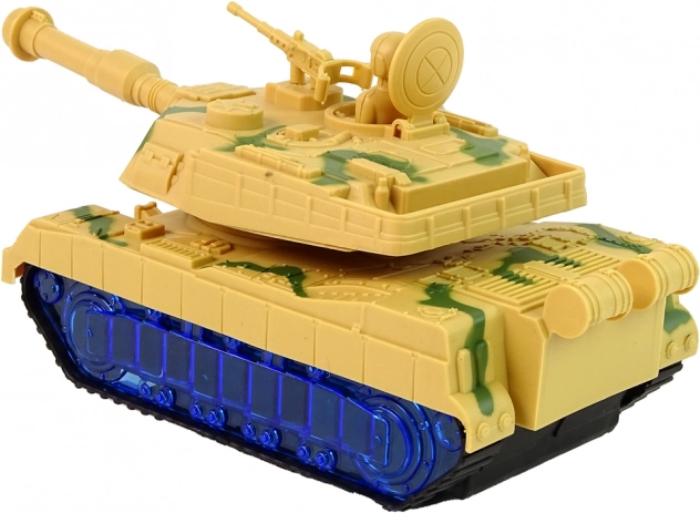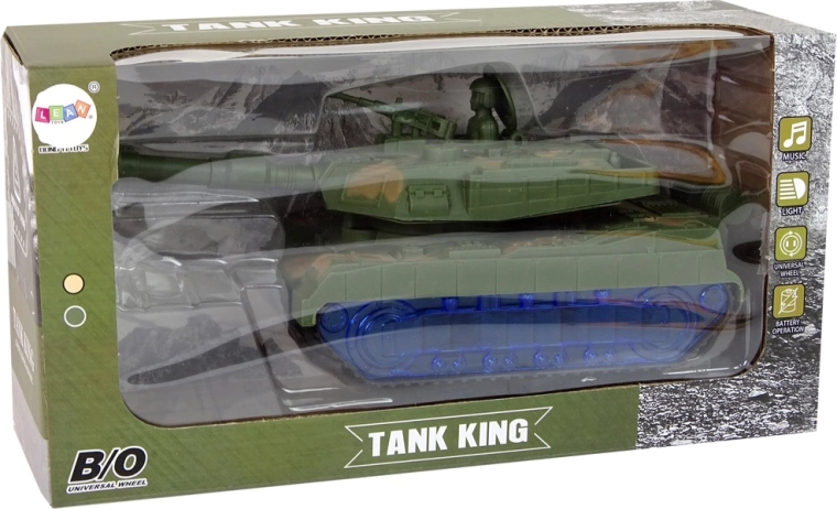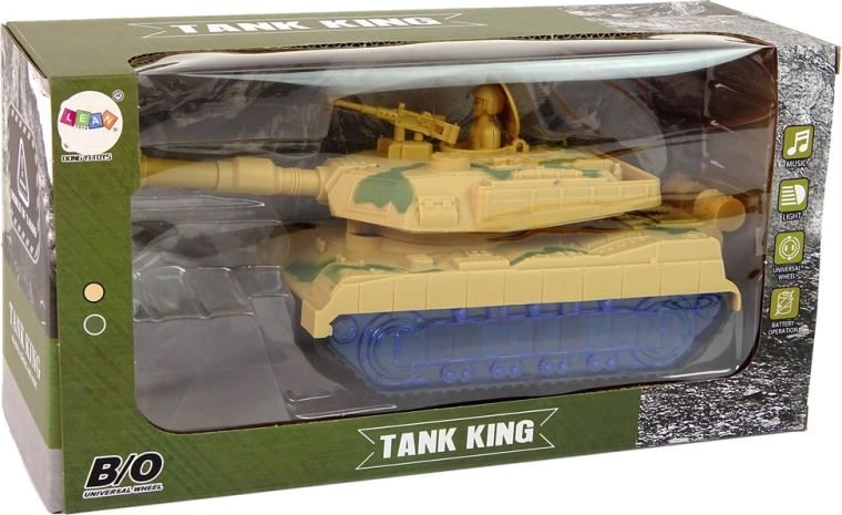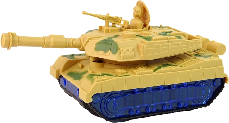 Il carro armato ha una livrea mimetica da combattimento e cingoli che imitano la guida di un vero carro. La sorpresa è che le ruote si illuminano di blu tramite LED. Una volta acceso, il cannone ruota da un lato all’altro e sullo sfondo si sentono i rumori del motore. Ogni dettaglio è identico a quello di un vero veicolo. Il carro è uno degli aiutanti della piccola battaglia.
