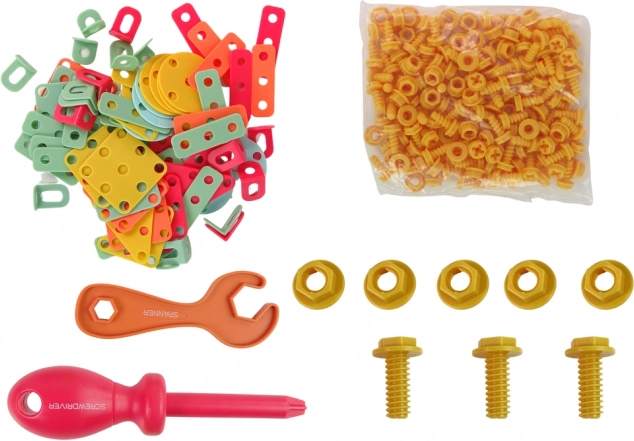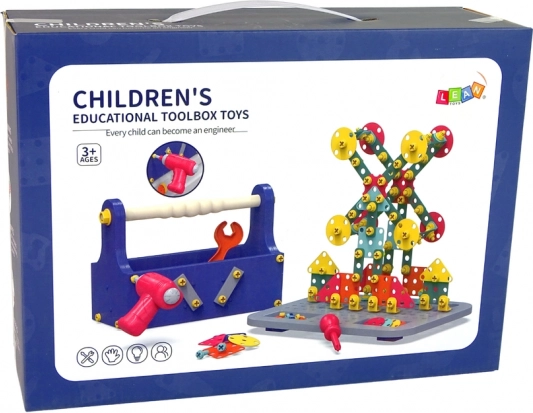 Contenuto della confezione: valigetta degli attrezzi da assemblare, avvitatore a batteria, piastra di montaggio, chiave piatta, cacciavite, grande set di dadi e viti, parti piatte a forma di figure geometriche.