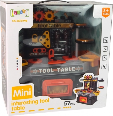 Set da officina creativo per piccoli fai‑da‑te con in totale 57 pezzi, per ore di divertimento e apprendimento. Include un banco da lavoro con pannello pensile, box portaoggetti, morsa, ingranaggi mobili e un ricco set di attrezzi. Sostiene lo sviluppo della motricità fine, della coordinazione e del riconoscimento di forme e colori.