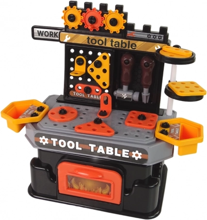 - Banco da lavoro con pannello, box portaoggetti, morsa, ingranaggi mobili, martello, cacciavite, viti e dadi, ganci per utensili, vano apribile, elementi da avvitare, piano di lavoro con fori