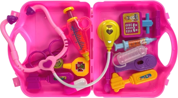 Una graziosa valigetta rosa da dottore per piccoli medici offre ore di gioco creativo e apprendimento. Contiene strumenti in plastica sicuri e un stetoscopio luminoso che, quando appoggiato, fa illuminare un cuoricino. I bambini allenano la motricità fine, la fantasia e superano più facilmente la paura della visita medica. Tutto è riposto in una pratica valigetta portatile.