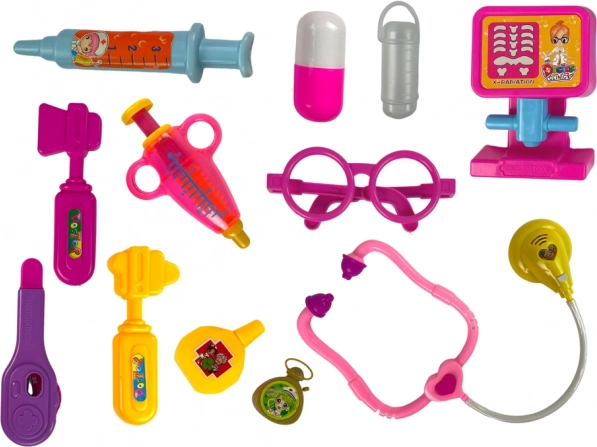 - Contenuto del set: 2x siringa, martelletto chirurgico, radiografia, termometro, grande barattolo a forma di compressa, piccoli contenitori per le “medicine”, stetoscopio con cuoricino, occhiali, coltellino, specchietto.
