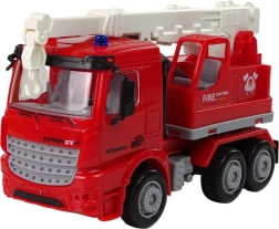 Camion dei pompieri rosso con scala bianca estensibile e ruote mobili. La scritta laterale 'FIRE CONTROL' aggiunge un elemento realistico per le operazioni di soccorso.