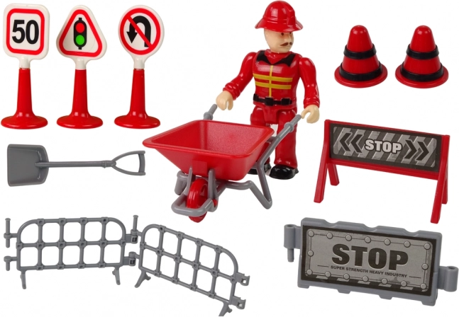 Il set include una figura in uniforme rossa, segnali stradali, una carriola e barriere. Perfetto per giochi di ruolo a tema costruzione o sicurezza stradale.