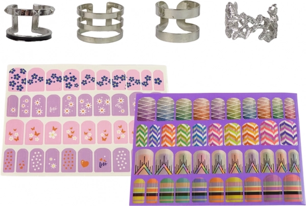 Adesivi e anellini di varie forme e motivi offrono infinite possibilità per la decorazione creativa delle unghie.