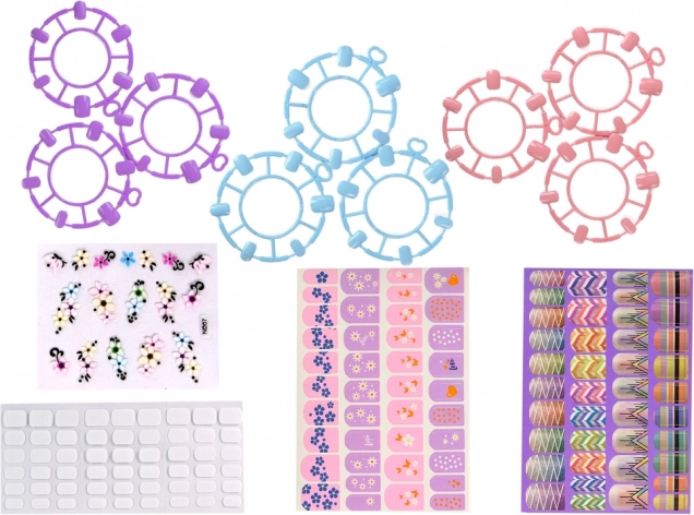 - Accessori ricchi: 2 smalti (arancione, blu), 3 glitter (blu, rosa, oro), adesivi con fiorellini e motivi, 2 lime a forma di cuore, 2 separatori rosa.