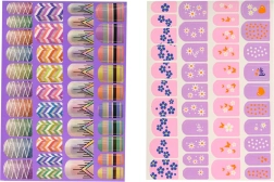 Decora le tue unghie con vari adesivi stampati e glitter in polvere in tre colori brillanti.