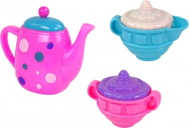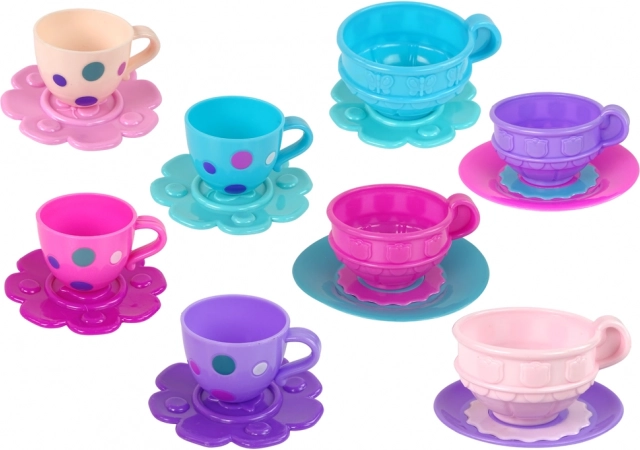 Il set include: 4 bicchieri colorati, 4 piattini, 4 cucchiaini, 4 forchette, 4 cucchiai, 4 ciotole, una teiera, una zuccheriera e una caffettiera.
