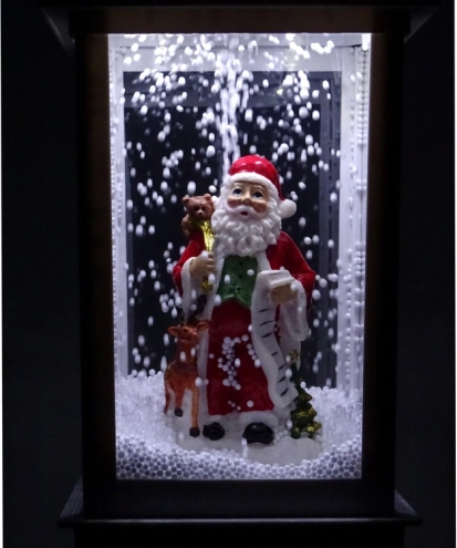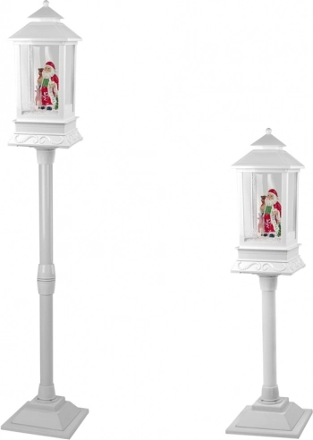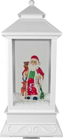Questa elegante lanterna bianca è perfetta per le decorazioni natalizie. All'interno c'è un allegro BABBO NATALE con un sacco di regali e una lunga lista di desideri. Una pompa integrata fa circolare la neve dalla base verso l'alto, così all'interno “nevica” continuamente, creando un incantevole spettacolo invernale. La solida struttura in plastica garantisce leggerezza e resistenza: potrai usarla ogni Natale, anno dopo anno.