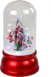 Questa decorazione natalizia combina il fascino della tradizionale sfera di neve con funzioni moderne. Una pompa integrata fa vorticare la neve artificiale, che cade dall’alto creando un realistico effetto di bufera invernale. All’interno troverai un allegro Babbo Natale con un pupazzo di neve sull’altalena e un alto comignolo in mattoni con albero di Natale: una scena che farà felici bambini e adulti.