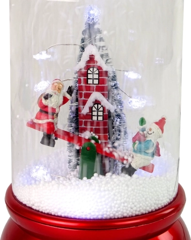 All’interno della sfera prende vita una scena allegra con Babbo Natale e un pupazzo di neve sull’altalena, completata da un alberello e un comignolo: ideale per il soggiorno o l’angolo dei bambini.