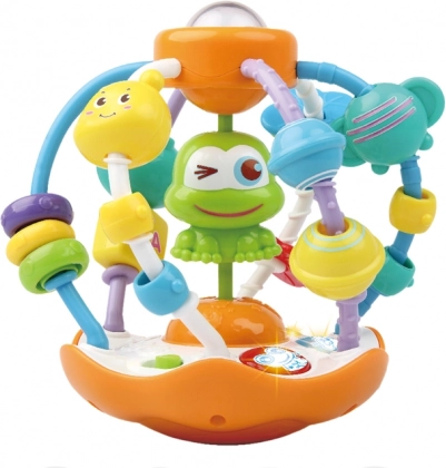 Questa coloratissima sfera interattiva è un aiuto ideale per lo sviluppo completo dei neonati. Grazie a diverse forme, colori, suoni e luci stimola vista, udito e tatto e sviluppa in modo naturale il pensiero logico. Al centro si nasconde una simpatica ranocchia, che ondeggia su e giù quando viene scossa, e sulla sommità trovi una pallina girevole per ulteriori scoperte.