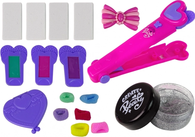 Oltre alle ciocche colorate, l'acconciatura può essere arricchita con altri accessori inclusi nel set, come elastici colorati, molletta a forma di fiocco, pettine, spugnette intercambiabili per il ferro e un gel con brillantini. Tutto è organizzato su una base per un gioco confortevole e piacevole.