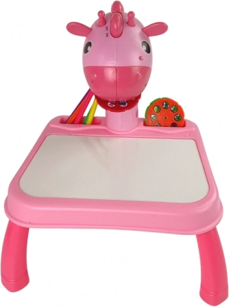 Proietta, ricalca e crea! Il tavolino con proiettore rosa con giraffa facilita ai bambini i primi passi nel disegno. Basta inserire uno dei tre dischi (per un totale di 24 immagini), accendere la luce e mettere a fuoco – i contorni vengono proiettati sulla superficie e il bambino può ricalcarli facilmente. L’illuminazione può essere accompagnata da 12 allegre melodie, rendendo l’attività ancora più divertente.