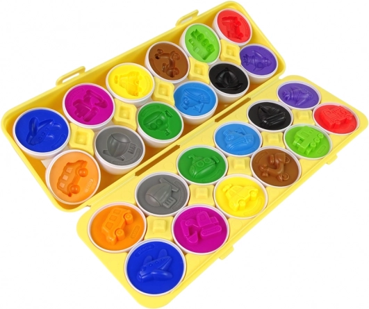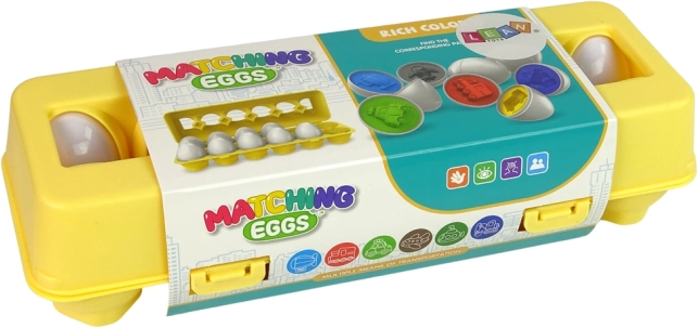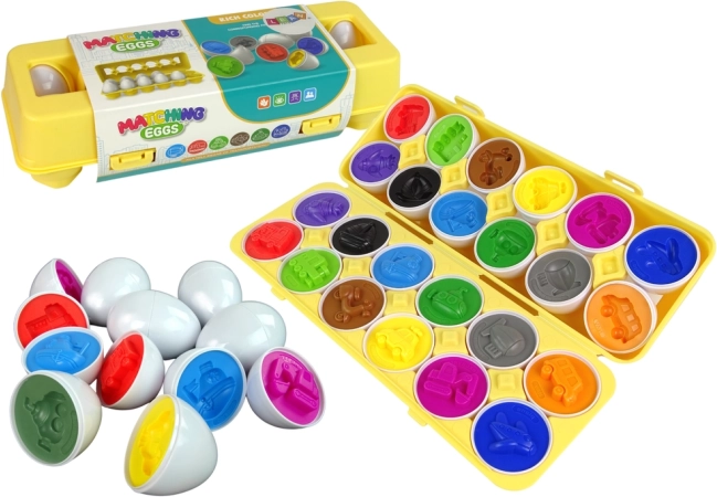 Gioco educativo divertente per bambini: set da 12 uova a tema veicoli, che si uniscono e si smistano per forma e colore. Sostiene la motricità fine, la coordinazione occhio–mano e il pensiero logico. Realizzato con materiali sicuri e resistenti, in una pratica scatola richiudibile a forma di portauova.