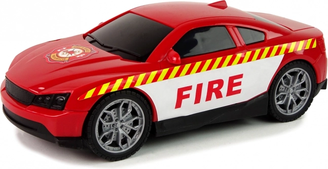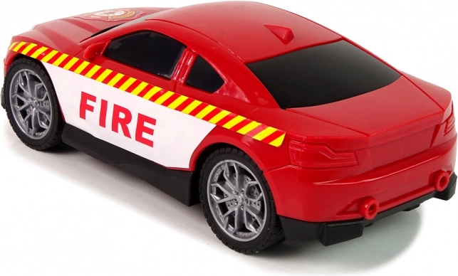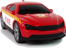Auto dei vigili del fuoco sportiva con vistose scritte FIRE e pneumatici in gomma sfreccia sui pavimenti lisci a velocità fulminea.