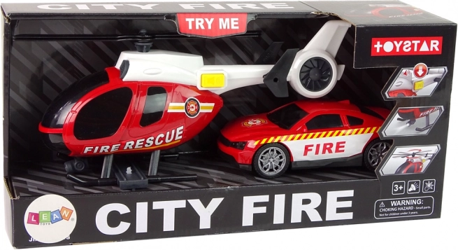 Questo set di salvataggio CITY FIRE offre ai bambini tutto ciò di cui hanno bisogno per i loro interventi dei pompieri. Il grande elicottero con la scritta FIRE RESCUE ha pale azionabili a mano con apertura di circa 20 cm e, premendo il pulsante laterale, attiva luci e suoni di avviamento e volo. L’auto dei vigili del fuoco sportiva con pneumatici in gomma e scritte vistose scorre fluidamente sulle superfici piane e completa gli scenari d’azione.