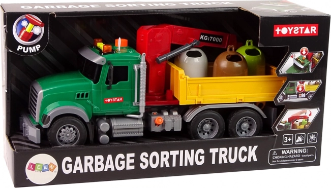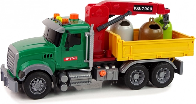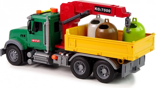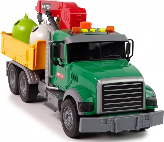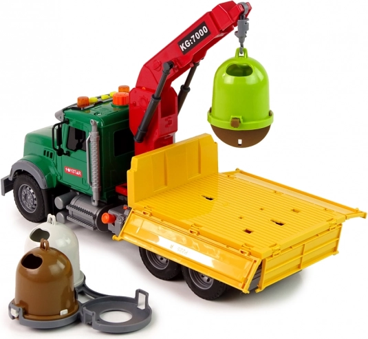 Questo camion dei rifiuti dettagliato trasporta tutto il necessario – dai container inclusi fino ai piccoli giocattoli. Il rimorchio posteriore è dotato di una gru mobile, che solleva e posa facilmente i container. Sul tetto della cabina si trova un pulsante di controllo per attivare il braccio della gru e gli effetti.