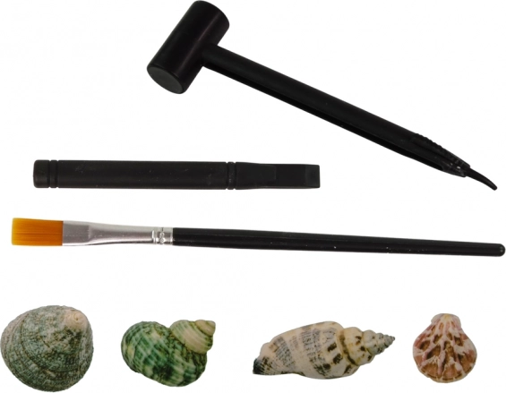 Nella confezione sono inclusi strumenti sicuri per piccoli archeologi: scalpello, martelletto e pennellino. I bambini allenano precisione, pazienza e manualità e possono creare nel tempo la propria collezione di conchiglie. Sulla confezione sono raffigurati i possibili modelli (ad es. pettine di mare, chiocciola verde, turridae, chiocciola con apertura nera, chiocciola con colorazione rossa), così il riconoscimento è semplice.