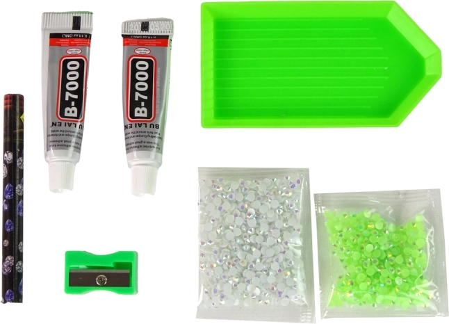 Include tutti gli elementi necessari, compresi due pacchetti di cristalli, colla, una ciotola per cristalli e bastoncino di cera.