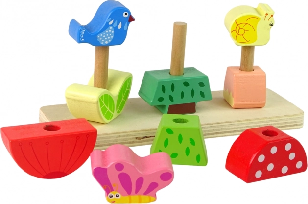 Questo puzzle in legno è composto da una solida base con tre pioli su cui i bambini inseriscono i pezzi di legno in qualsiasi ordine, in modo che armonizzino tra loro. I pezzi raffigurano piante, farfalle e uccelli: il compito è abbinarli correttamente al loro ambiente naturale, ad esempio la farfalla al fiore o l'uccello all'albero. Il puzzle sviluppa così l'immaginazione e le conoscenze sulla natura.