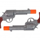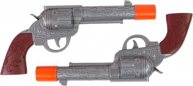 Pistole in plastica con puntali arancioni e suono di sparo alla pressione del grilletto: aumentano il realismo del gioco salvaguardando la sicurezza.