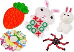 La confezione contiene in totale 24 pezzi: tris (tic-tac-toe), pop it carota, 4 figure di coniglietti, spinner + spinner Happy Easter, 3 giochi saltellanti, 6 serpenti di gomma, coniglio antistress, 2 conigli squishy (gniotky), 4 anelli, 2 conigli schiacciabili, coniglio pop it con rilievo e 4 uova pieghevoli. Grazie alle dimensioni compatte, il set è adatto ai viaggi e alla scuola materna.