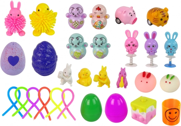 - cubo sensoriale, cubo pieghevole, 4 figurine (coniglio, pulcino), 6 figurine in plastica (coniglio, pulcino), gioco del tris, 2 conigli da strizzare, 6 serpenti in gomma, 3 giocattoli saltellanti, 2 sorprese nell’ovetto, 2 macchinine a retrocarica (tigre, maialino), molla, 2 puzzle apribili nell’ovetto, 2 conigli in gomma antistress, giocattolo da sviluppare, portachiavi coniglio pop it