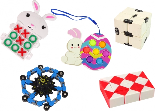 Rendi felici bambini e adulti con questo set pasquale da 36 giocattoli fidget. Una collezione colorata per stimolazione sensoriale, riduzione dello stress e sviluppo della motricità fine, con coniglietti, pulcini, giocattoli saltellanti, portachiavi pop it, serpenti, cubi e altro ancora. Tutto realizzato con materiali atossici e resistenti, ideale come regalo di Pasqua o piccole ricompense.