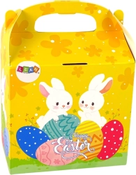 Confezione regalo pratica con coniglietti e uova, facile da trasportare grazie al manico. Regalo ideale per i bambini a Pasqua.
