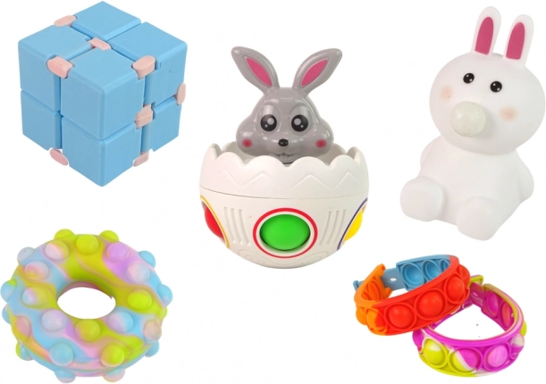Pop it donut, braccialetti, coniglietto e ovetto, pupazzetti antistress e cubo fidget: perfetti per il gioco sensoriale e per alleviare lo stress.