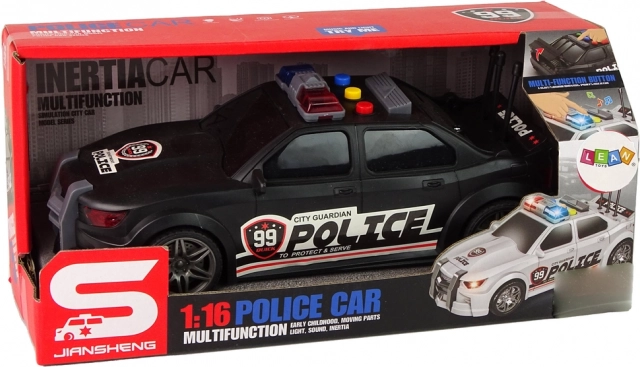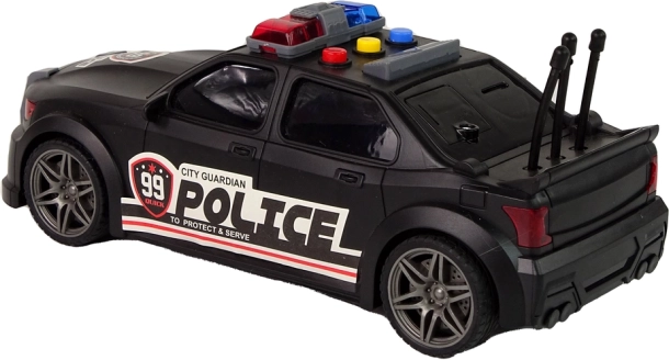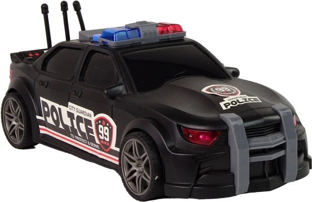 Finitura sportiva nera con scritte POLICE, lampeggianti blu-rossi e antenne dona al giocattolo un aspetto realistico.
