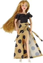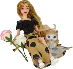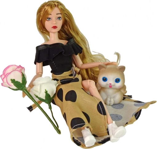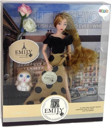 La bambola Emily indossa una elegante blusa nera e una lunga gonna beige a pois. Ha capelli lunghi ideali per pettinare e creare acconciature, un viso dipinto realisticamente con occhi azzurri ed è completamente posizionabile grazie alle articolazioni. Nella confezione trovi anche un dolce gattino e rose decorative, che arricchiscono le storie quotidiane e il gioco di ruolo in famiglia.